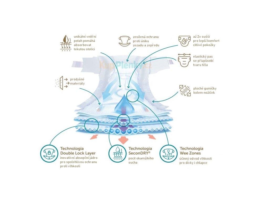 - Technologie SeconDRY dodává pocit okamžitého sucha, díky kterému zůstává povrch plenky suchý a příjemný pro pokožku.